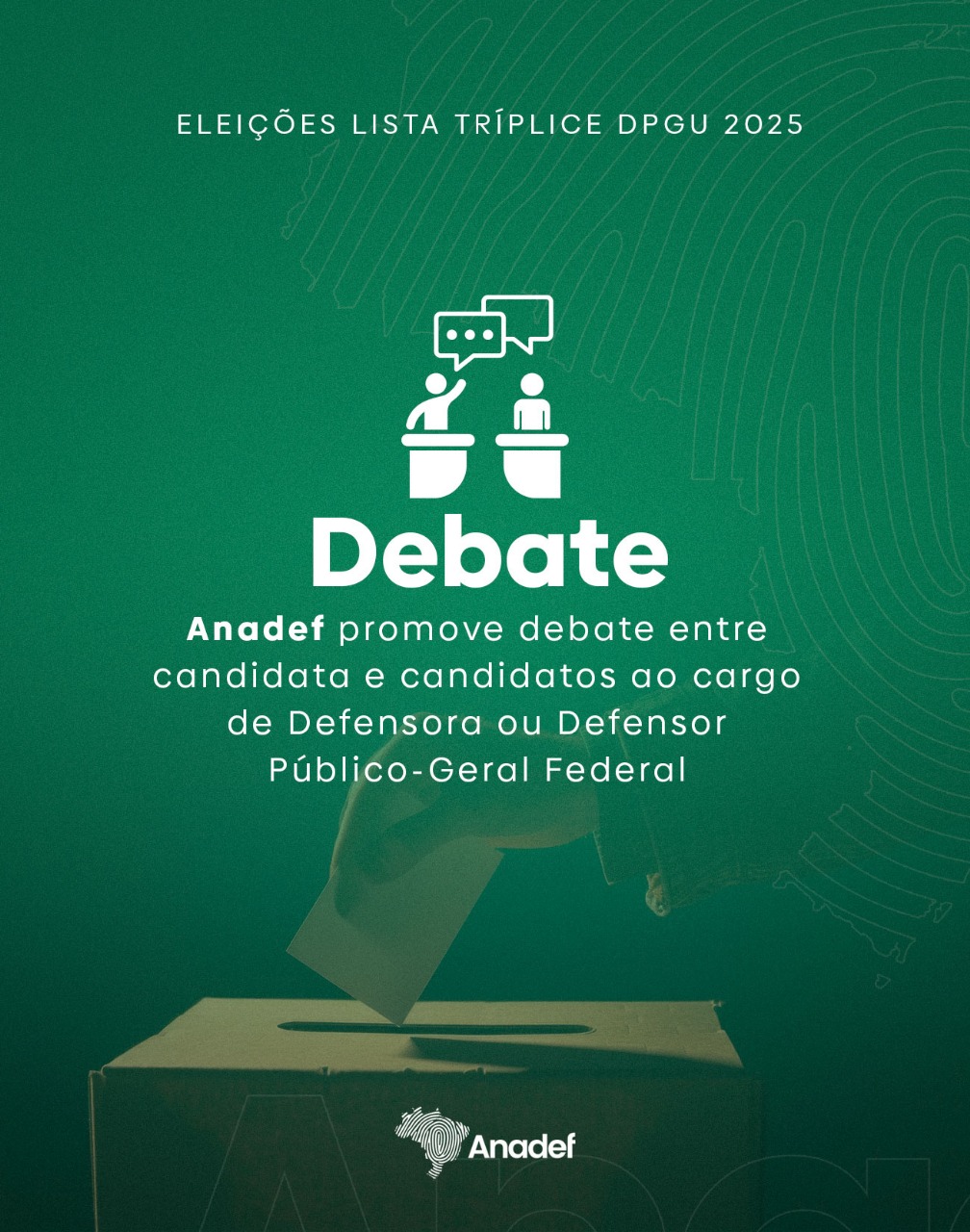 Com o compromisso de fortalecer o diálogo democrático e assegurar ampla participação da carreira, a Associação Nacional das Defensoras e Defensores Públicos Federais (ANADEF) anuncia a realização de debates virtuais entre a candidata e os candidatos ao cargo de Defensor(a) Público(a)-Geral Federal.